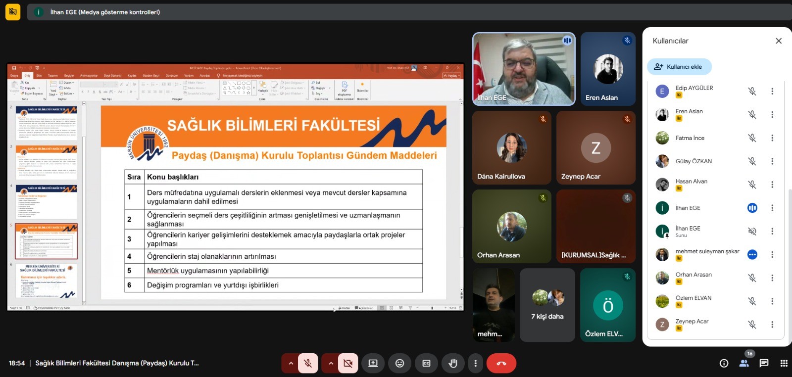 Mersin Üniversitesi Sağlık Bilimleri Fakültesi Paydaş Danışma Kurulu, 22 Kasım 2025 Cumartesi günü çevrimiçi olarak toplandı. Toplantıya akademik yöneticiler, dış paydaşlar, sektör temsilcileri ve öğrenci temsilcileri katılım sağladı. Toplantıda fakültemizin eğitim–öğretim süreçleri, uygulama alanları, öğrenci faaliyetleri ve paydaş iş birliklerinin güçlendirilmesine yönelik genel değerlendirmeler yapıldı. Öğrenci temsilcileri programlara ilişkin görüşlerini paylaşırken, dış paydaşlar iş birliği ve uygulama süreçlerine katkı sunabilecek önerilerde bulundu. Toplantı, fakülte–paydaş iletişimini güçlendirmek, iş birliği olanaklarını artırmak ve eğitim kalitesini geliştirmek adına verimli bir şekilde tamamlandı.