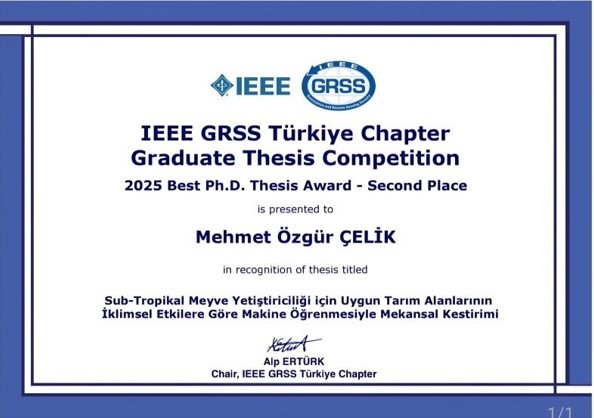 Üniversitemiz Fen Bilimleri Enstitüsü Uzaktan Algılama ve Coğrafi Bilgi Sistemleri Anabilim Dalı doktora öğrencisi Mehmet Özgür Çelik, IEEE GRSS Türkiye Chapter tarafından düzenlenen IEEE GRSS Türkiye Graduate Thesis Competition kapsamında, doktora tezi ile “2025 Best Ph.D. Thesis Award – Second Place” ödülüne layık görüldü.