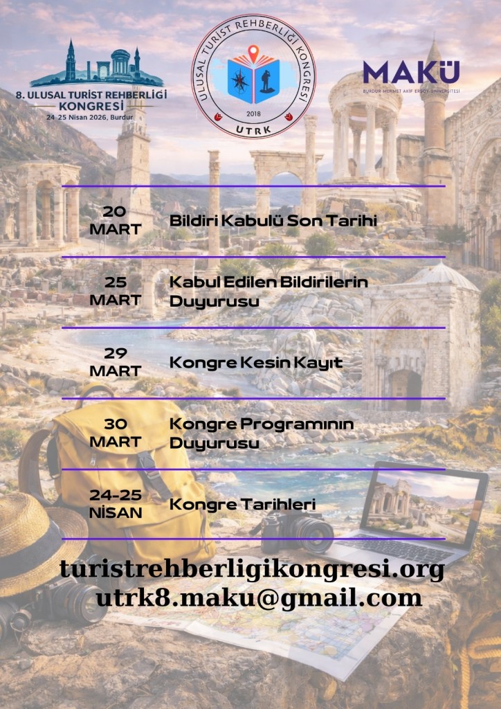 Turizm Rehberliği alanında ulusal bilimsel iletişimi ve mesleki paylaşımı güçlendirmek amacıyla düzenlenen 8. Ulusal Turist Rehberliği Kongresi 2026 yılı programı kapsamında planlanmıştır.