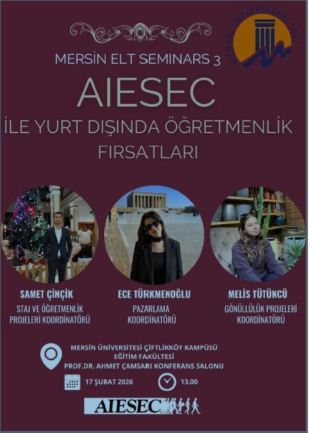 Mersin ELT seminerler serisinin 3. sü, AISEC temsilcileri tarafından ‘Global Teacher’ programı ile yurtdışı öğretmenlik ve gönüllülük projeleri tanıtımları ilev 17.02.2026 tarihinde gerçekleştirildi. AISEC temsilcileri yurtdışında öğretmenlik fırsatlarına yönelik başvuru sistemlerini ve süreçlerini anlattılar ve sürece daha önce katılmış olan bir temsilci deneyimlerini paylaştı. Temsilciler programı tanıtarak öğrencilerimizin sorularını cevaplandırdı.