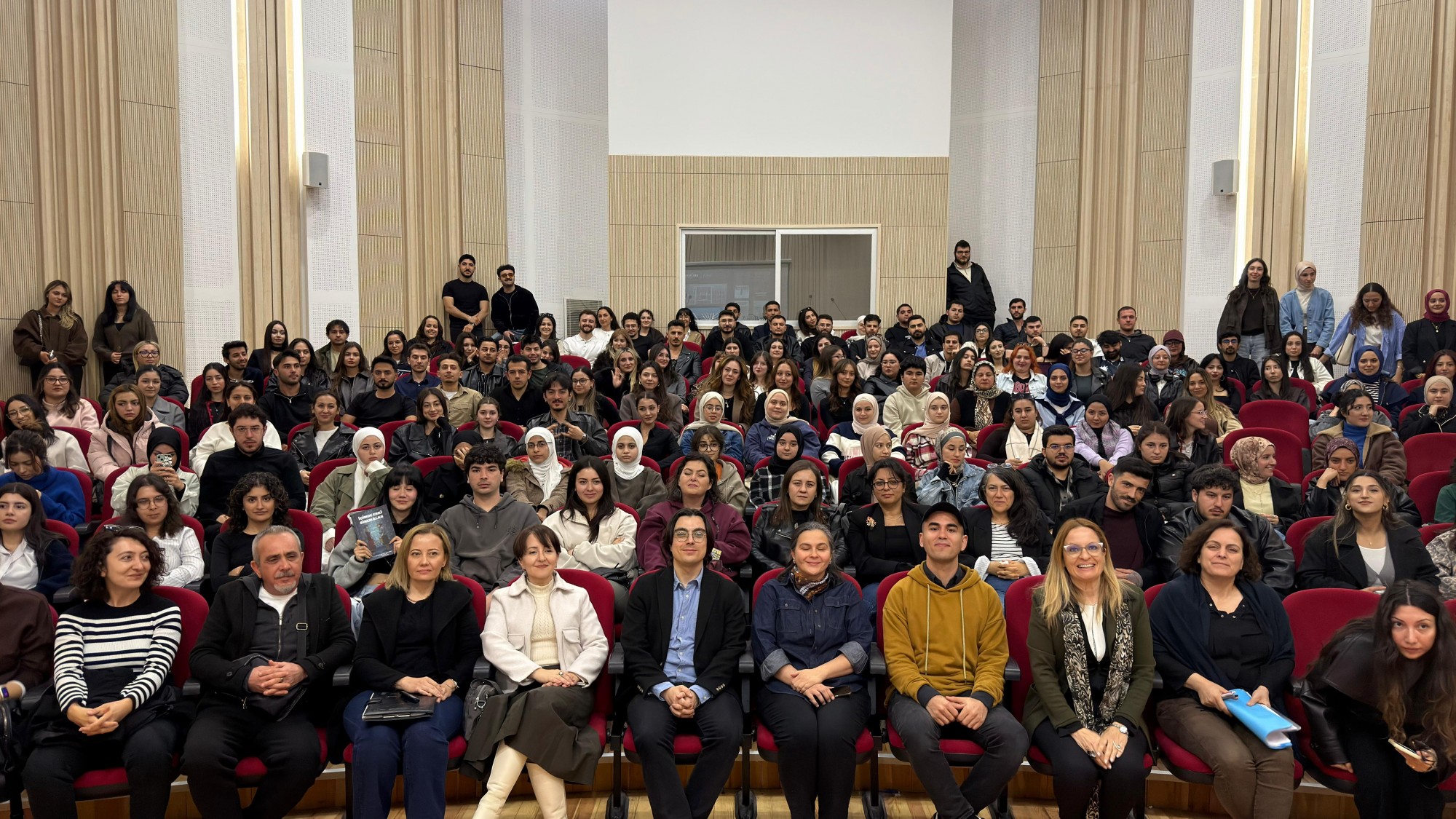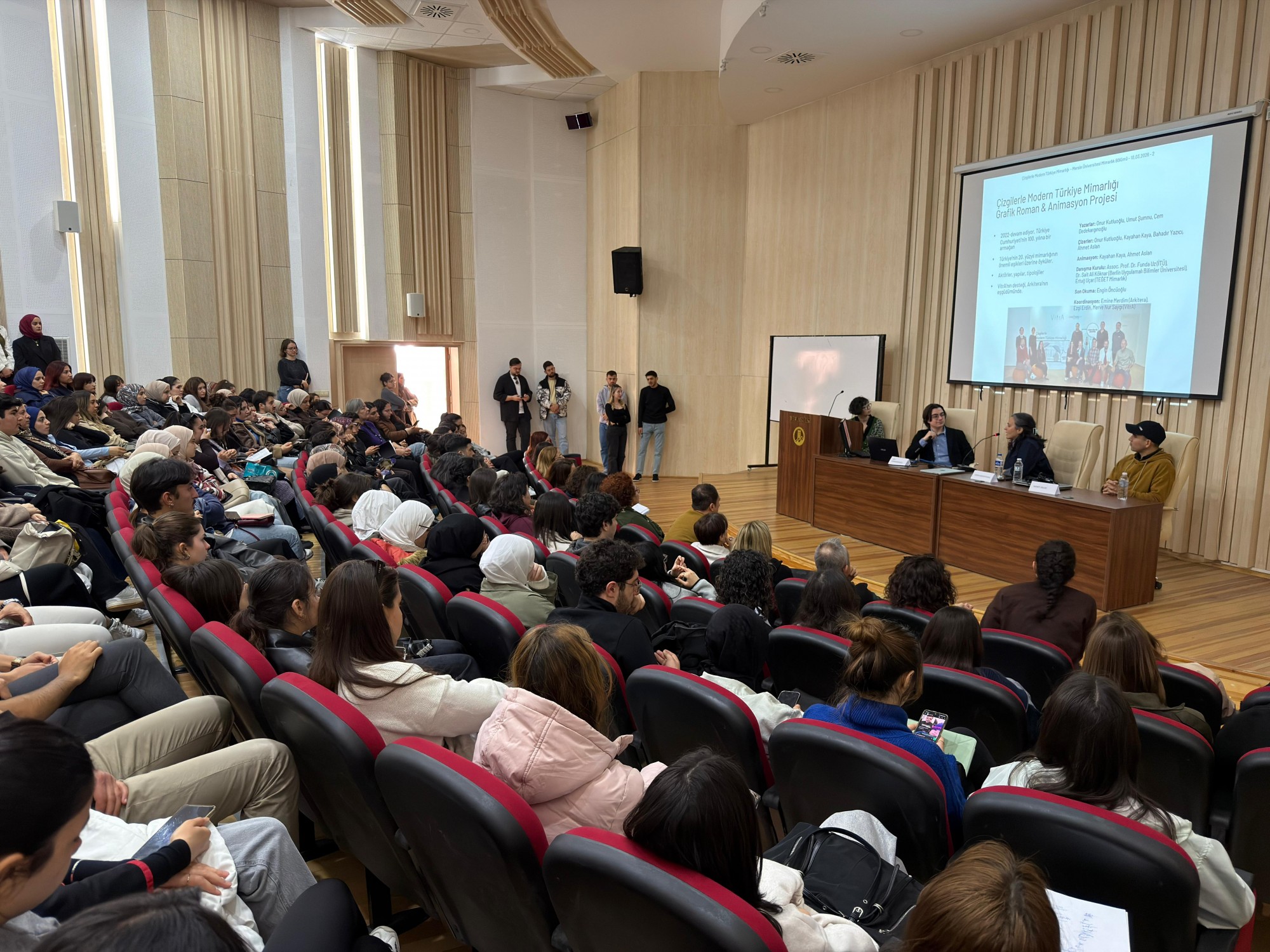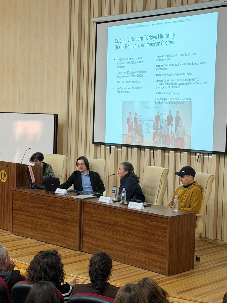 “Çizgilerle Modern Türkiye Mimarlığı” kitap serisi kapsamında gerçekleştirilen kampüs söyleşileri serisi, 10 Mart 2026 Salı günü Mimarlık Konferans Salonu'nda düzenlendi. Cumhuriyet’in 100. yılı için VitrA ve Arkitera iş birliğiyle geliştirilen bu kitap serisi, Modern Türkiye’nin inşa edilmesinde öncü rol oynayan Türk mimarların ve yapıların hikayelerini grafik romanlarla anlatmaktadır. Alanında uzman, kalabalık bir grubun oluşturduğu proje ekibinden Arkitera Mimarlık Merkezi Genel Koordinatörü Emine Merdim, serinin yazarlarından Bilkent Üniversitesi İç Mimarlık ve Çevre Tasarımı Öğretim Görevlisi Cem Dedekargınoğlu, ve çizerlerinden İç Mimar Ahmet Aslan etkinliğe katılım göstermiştir. Vitra Mimar İlişkileri Müdürü Merve Nur Saygı da online olarak panele dahil olmuştur. Öğrencilerin yoğun katılım gösterdiği etkinlik, Mimarlık Fakültesi Dekanı Sayın Prof. Dr. Nida Naycı, proje ekibinden Emine Merdim Yılmaz ve Merve Nur Saygı konuşmaları ile açılmış, sonrasında serisinin yayınlanan son kitabı “İçimdeki Eski Sinemalar”ın animasyon filmi gösterilmiştir. Etkinlik, kitap serisi ile ilgili Cem Dedekargınoğlu ve Ahmet Aslan’ın sunumu sonrası soru ve cevap kısmıyla son bulmuştur.
