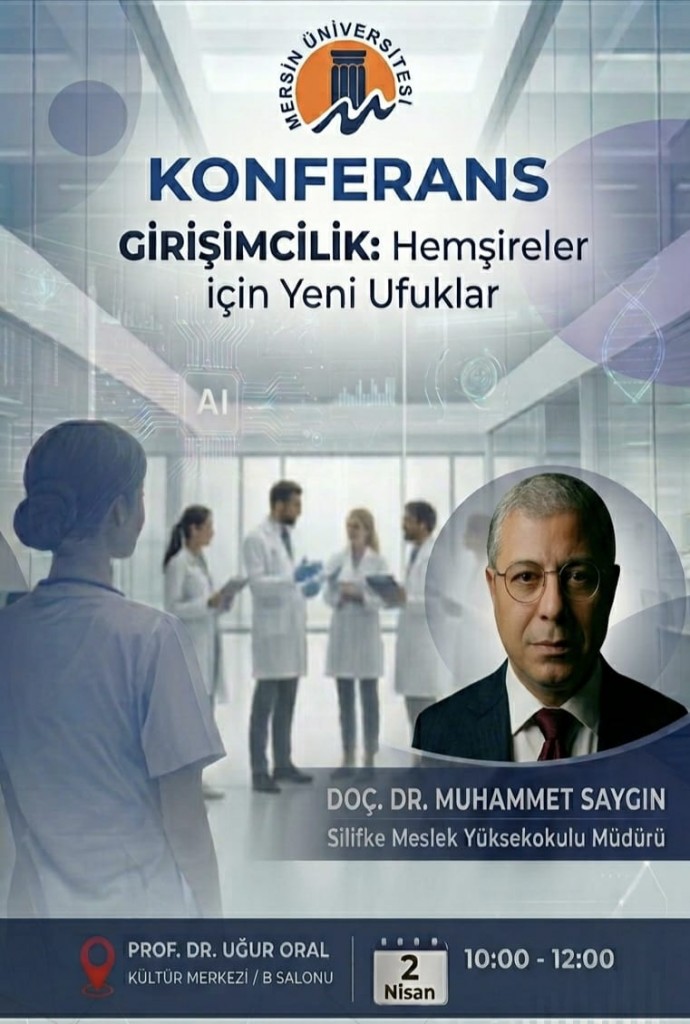 Mersin Üniversitesi Uğur Oral Kültür Merkezi B Salonu'nda, 2 Nisan 2026 Perşembe günü saat 10:00'da "Girişimcilik: Hemşireler İçin Yeni Ufuklar" başlıklı konferans gerçekleştirilecektir. Konferansta, Silifke Meslek Yüksekokulu Müdürü Doç. Dr. Muhammet SAYGIN konuşmacı olarak yer alacaktır.