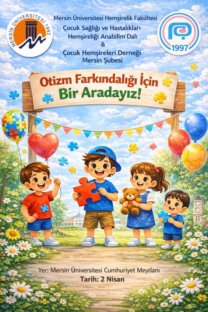 Mersin Üniversitesi Hemşirelik Fakültesi olarak, Çocuk Sağlığı ve Hastalıkları Hemşireliği Ana Bilim Dalı ve Çocuk Hemşireleri Derneği Mersin Şubesi iş birliğiyle otizm farkındalığını artırmak amacıyla 2 Nisan 2026 tarihinde etkinlik düzenlenecektir. Farklılıkların bir zenginlik olduğunu hatırlamak, empatiyi güçlendirmek ve toplumsal duyarlılığı artırmak amacıyla düzenlenen etkinliğe tüm öğrencilerimiz ve personelimiz davetlidir.